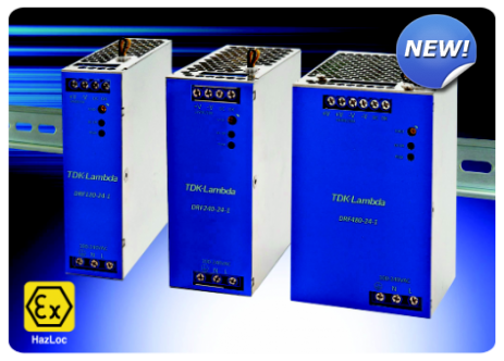 Featuring IECEx / ATEX and DNV / German Lloyd / Class 1 Div 2 approvals for hazardous and marine applications, the DRF/HL models extend the existing DRF series of 120 to 480W DIN rail mount power supplies. Accepting a wide range AC input of 85 to 265V (300V for 5s), these highly efficient power supplies can deliver a peak load of 150% in compact, slim-line packages.